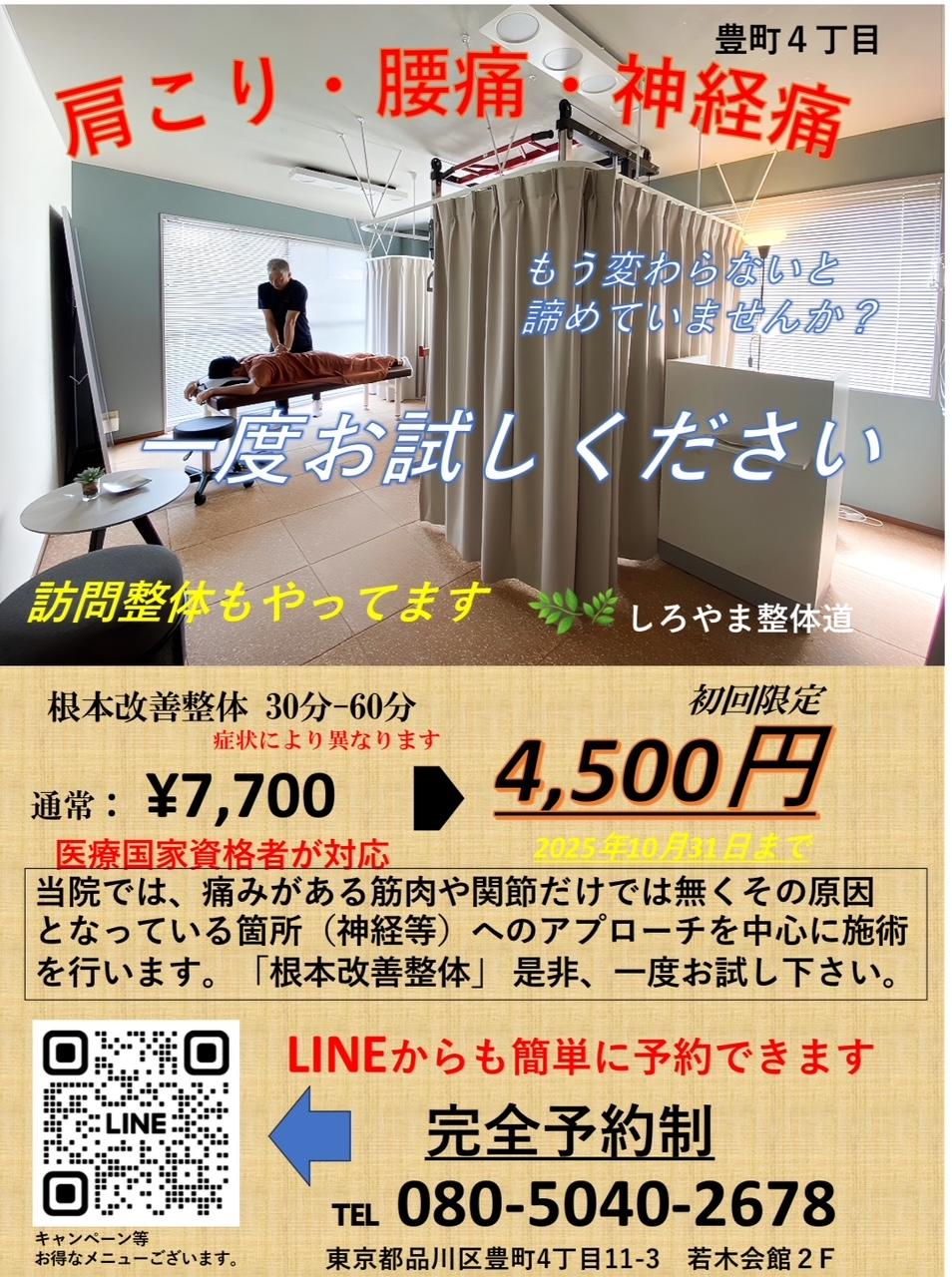 この度、品川区豊町にて「しろやま整体道」を開設させていただく事となりました院長の城山大助でございます。当院では、国家資格取得者である柔道整復師がオールハンドでの施術と多くのスポーツ・武道の経験から得たトレーニング技術・運動療法とそれらを融合させた独自療法にてカラダを根本から改善させていく事を目指しております。お客様のカラダ革命の一助になれれば幸いでございます。是非一緒にあなたのカラダ革命にチャレンジしてみませんか。